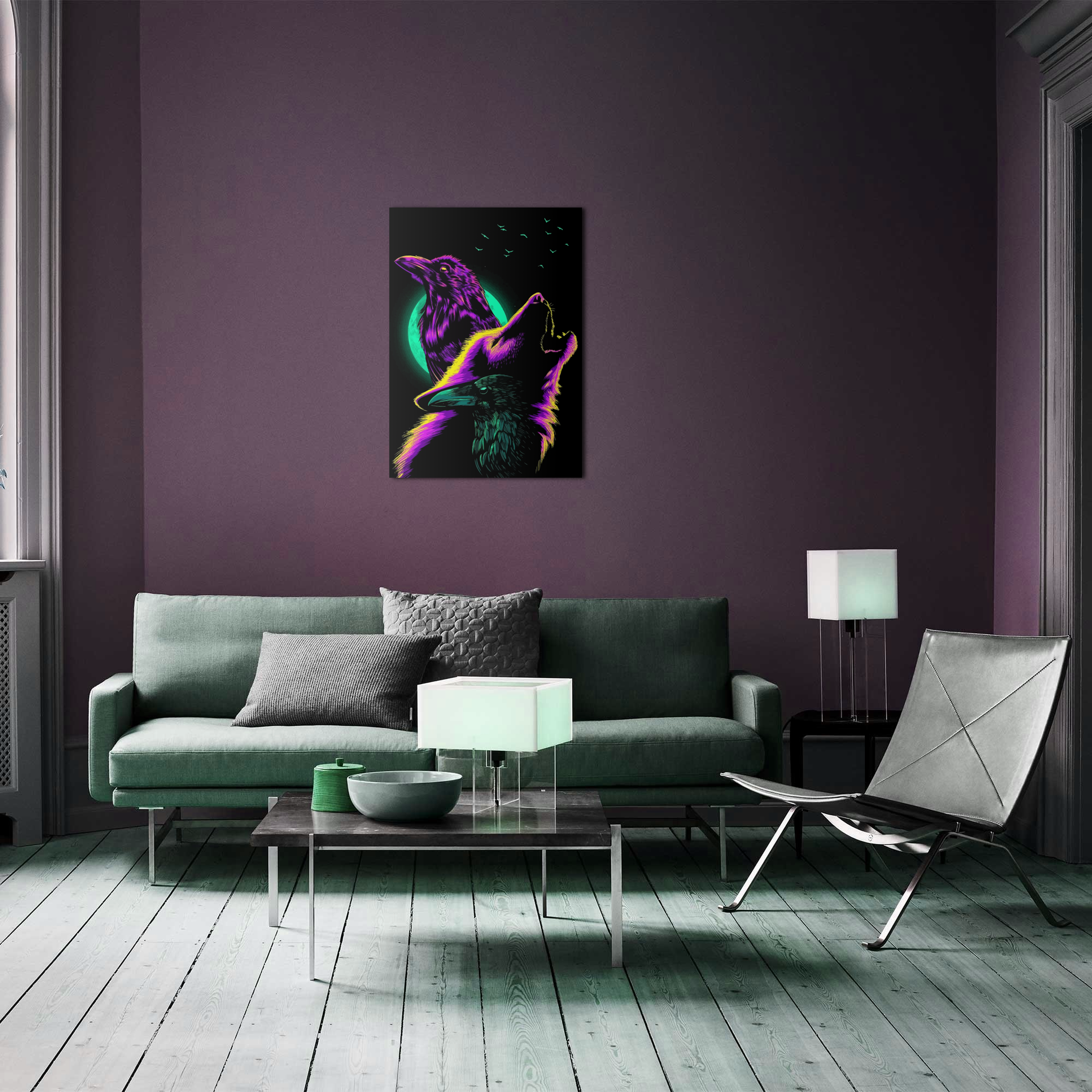 This metal poster features a stunning design of a wolf and a group of crows howling and perched in front of a full moon. The intricate details and vibrant colors are sure to make a statement in any space. Perfect for animal lovers, Halloween enthusiasts, or anyone who appreciates the beauty of the night. Hang it in your home, office, or give it as a unique gift.